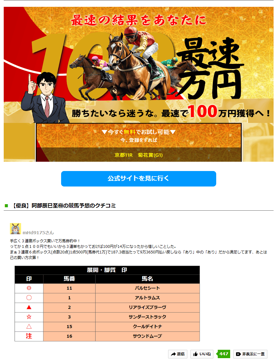 【mHd9175さん】から届いた口コミをピックアップしてご紹介&JRA結果を引用しておりますのでご確認下さい。