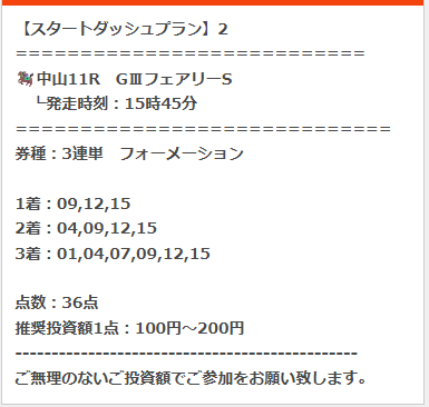おそらく初回しか適応されない『スタートダッシュプラン』想定配当30~50万円、通常価格→7万円が9,800円。 安いし負けてもいいや感覚でやったらスタートダッシュどころか上半期分の収支をたった1レースで稼がせてもらいました。 フェアリーステークス15-4-1的中で、結果は公式乗ってるので引用はしませんが払い戻しは1点200円で賭けていたので175万8160円払い戻し、想定配当×3倍以上!