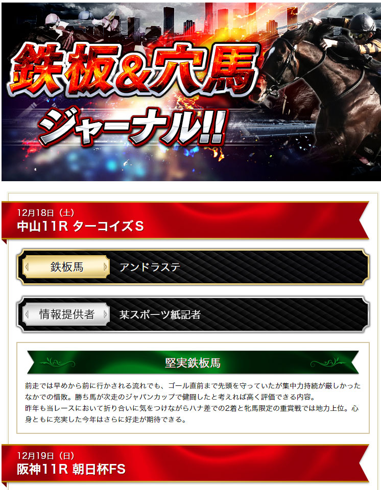 11/22の未勝利戦での54万的中は今も嬉しい好爆的中です! 今週も期待しています、G1は堅い決着になりそうだから今週は平場の方がもうかりそうですよね、お知らせにも届いていましたけどね★