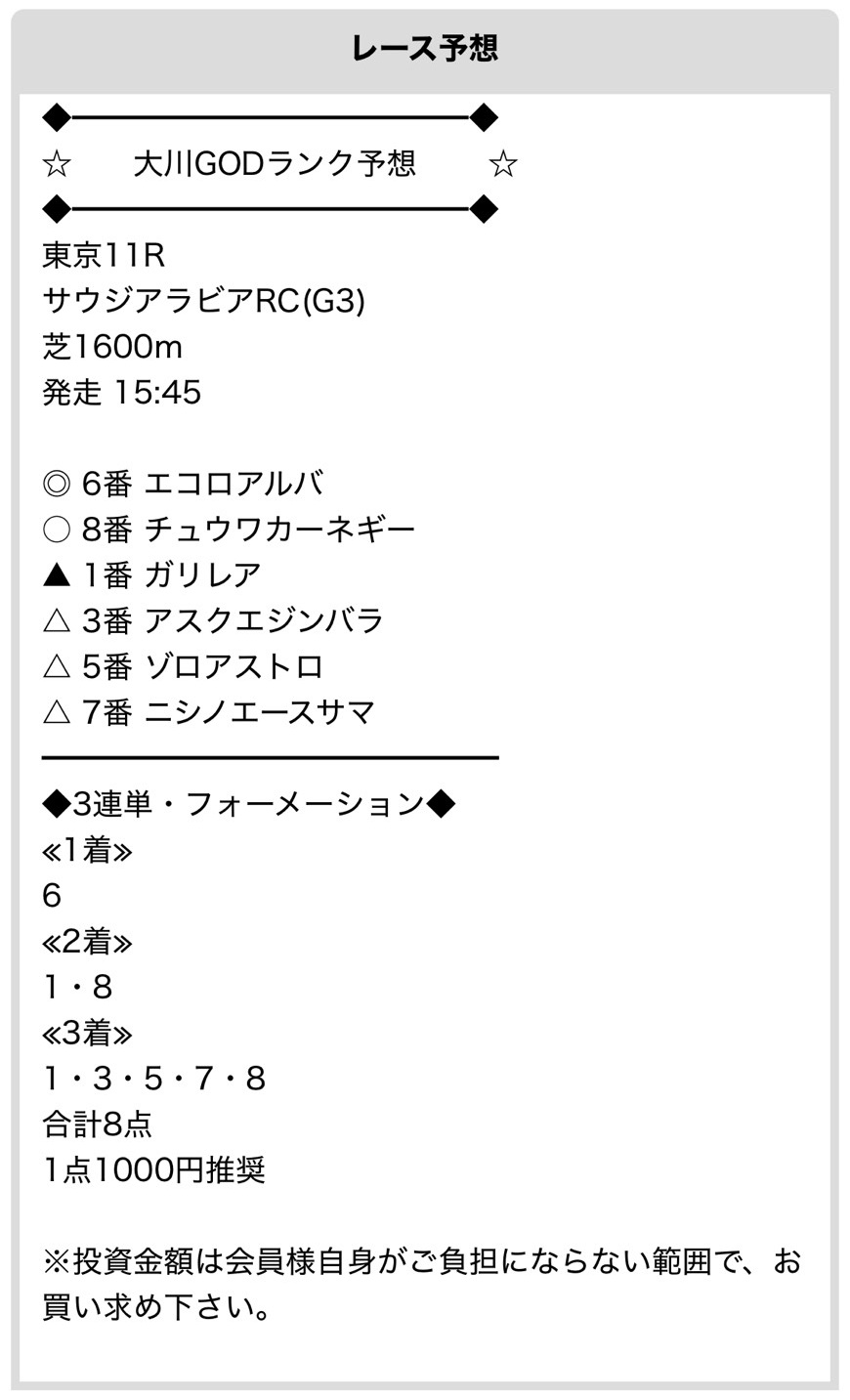 先週のサウジもバッチリ的中貰えて16万1650円払い戻し、今週も楽しみに予想待っています。