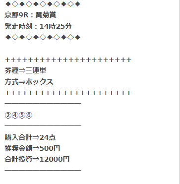 これで4回目の利用だけどプラス収支継続です。 なかには不的中もあるけど競馬だから絶対はないと考えています。 いくら的中したってトリガミだと意味がありませんからね。 今回も的中&不的中はありましたがプラス収支。 京都9R単体では30万2750円払戻しいただけました。