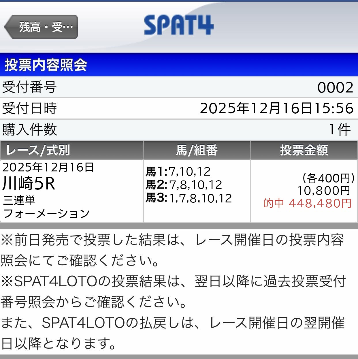 12/15(月)無料情報利用の検証結果です。 金沢3R予想、3連複フォーメーション買い目10点予想 1点500円・馬券代5000円 結果→3連複/110.7倍的中 払戻→5万5350円 余談ですが3連単も同じ買い目で361.3倍的中 3連複で5万弱でしたが3連単5-4-2的中した買い目で買っていれば 払戻18万650円、タラレバになってしまうが こっちも買ってれば3連複の3倍ちかく稼げました。