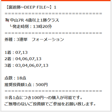 思わず叫んでしまった的中!でした、久々にこんな馬券獲りました、ウォッカがダービー勝ったぶりくらいだから10年以上昔以来の的中、まじで感謝、ありがとうございます。11人気1着、13人気2着、オッズが跳ね上がり60万馬券決着 100円でしか買ってなかったけど62万250円になりました。 今週も絶対に使います。