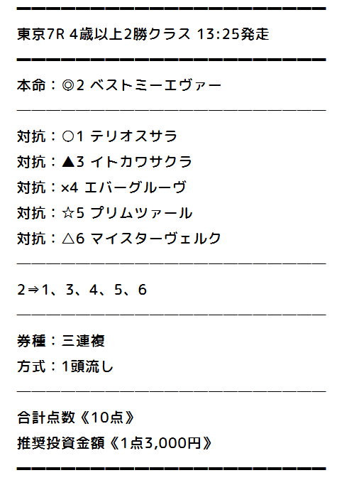 東京7レース、推奨買い目通り、推奨投資金額で馬券購入。